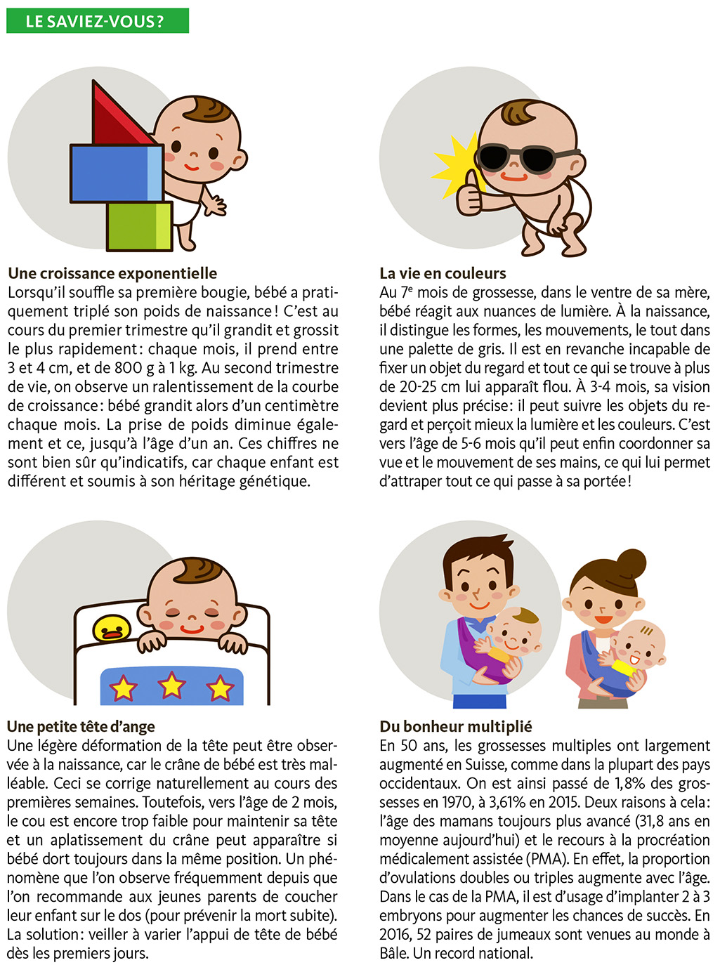 Tour à tour dormeur et gourmand, joueur et souriant, explorateur et turbulent, les multiples facettes de votre bébé n’ont pas fini de vous étonner ! Au cours des premiers mois, ses capacités se développent si vite qu’elles vous laissent à peine le temps de vous émerveiller. Chaque jour un regard plus intense, un sourire plus franc, un geste plus précis, un babillage plus intelligible, tant de choses en apparence anodines mais qui comblent de bonheur tous les parents. Santé Mieux-Être vous livre ici quelques informations et conseils pour que ce bonheur ne soit jamais contrarié.